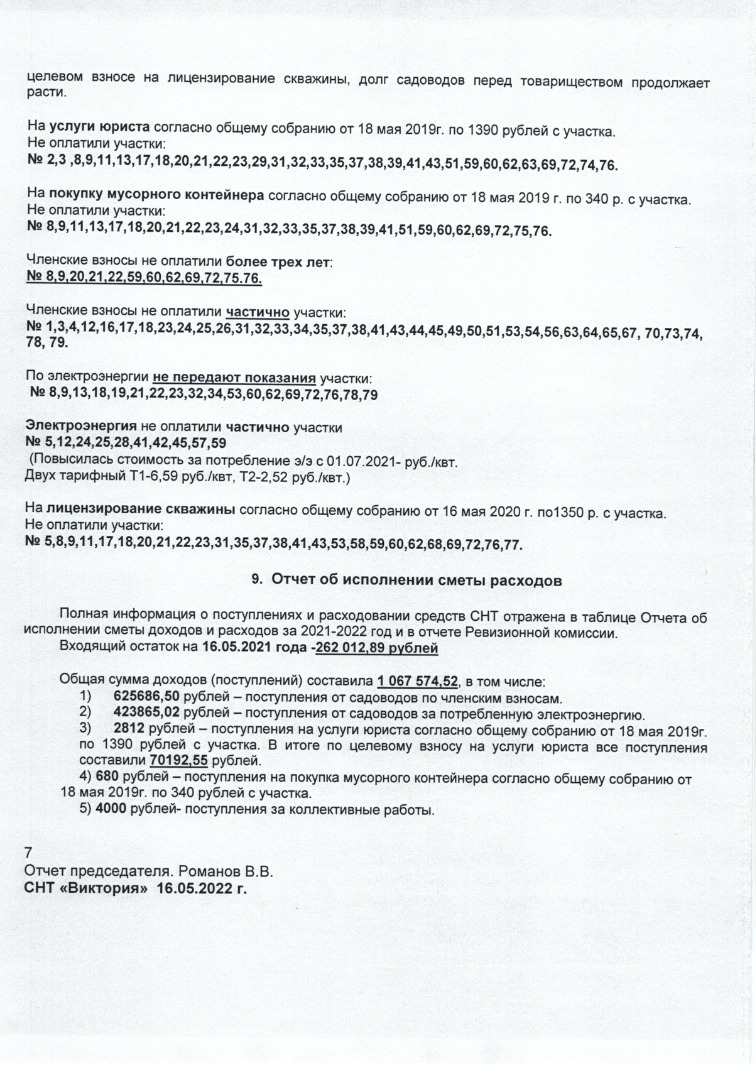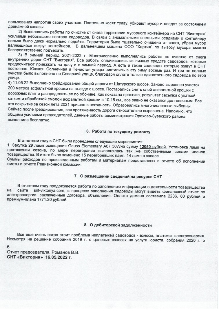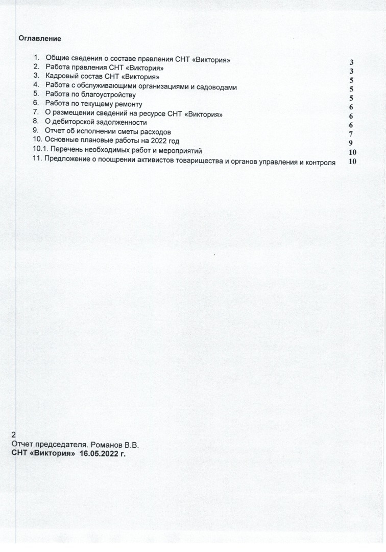Управление деятельностью СНТ "Виктория" осуществляется исходя из принципа соблюдения разумного баланса между комфортным качеством проживания в СНТ и утвержденной сметой доходов и расходов товарищества при обязательном соблюдении всех норм действующего законодательства в соответствии с уставной деятельностью СНТ "Виктория". Председатель СНТ «Виктория» информирует Вас о проделанной им работе за май 2021 - май 2022 года.