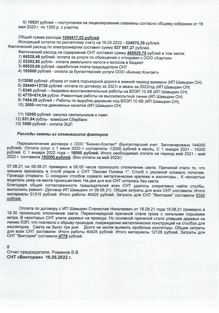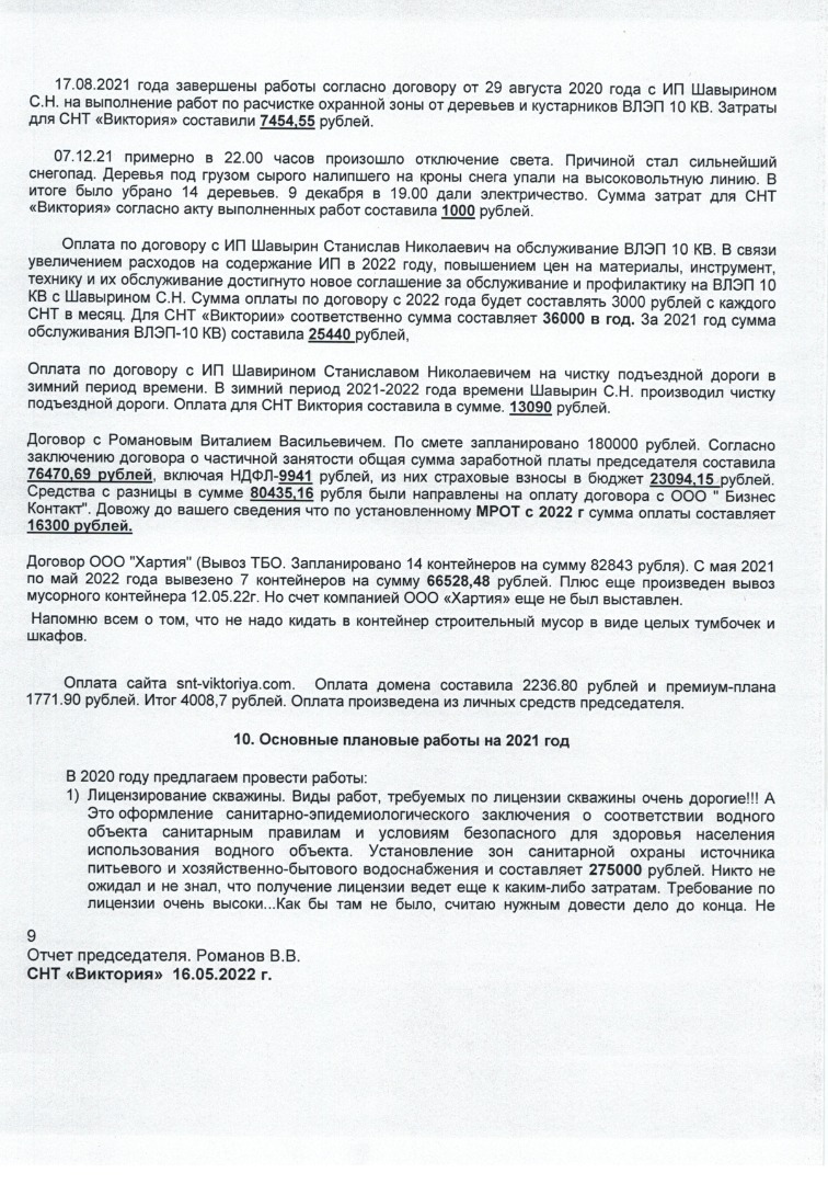На данном этапе заключается договор с ИП Шавирином Станиславом Николаевичем на чистку подъездной дороги в зимний период времени. В зимний период 2021 года времени Шавырин С.Н. производил чистку подъездной дороги. Оплата для СНТ Виктория составила в сумме. 7143 рубля. Оплата еще не производилась. Нет актов выполненных работ. Документы будут составлены после общего собрания председателей всех семи СНТ (Кустовое собрание председателей).